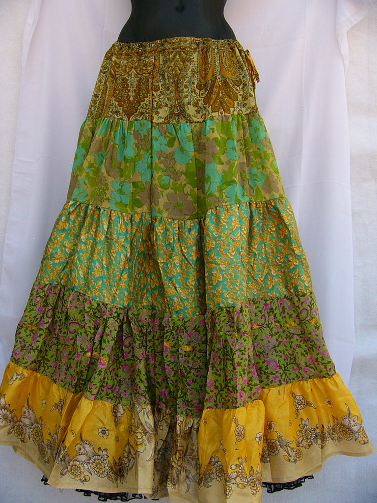 Vintage Sari Silk Skirt - Patterns in Green Cream Brown Yellow